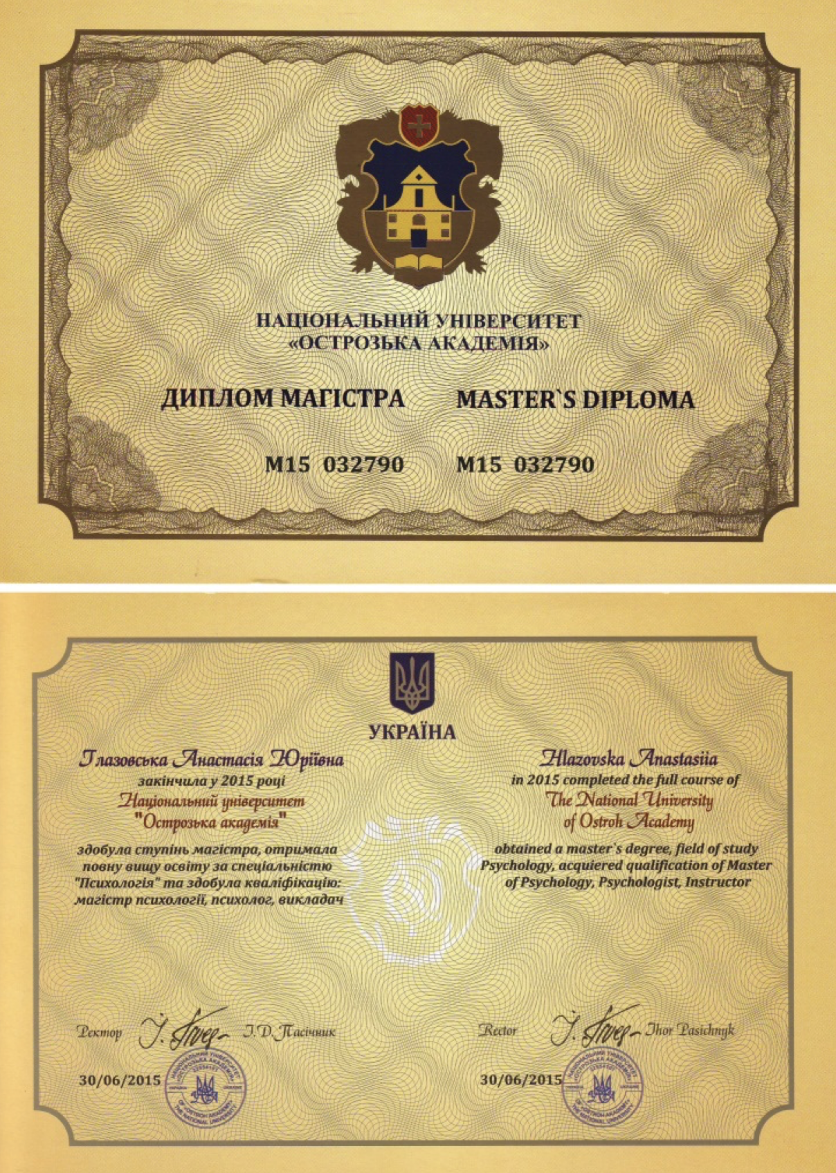 Я здобула ступінь бакалавра у Таврійському національному університеті імені В. І. Вернадського, а магістра — у Національному університеті «Острозька академія». Також пройшла навчання з коучингу, психологічного консультування та завершила програму з КПТ-консультування. Зараз навчаюся на 4-річній базовій програмі в Українському інституті когнітивно-поведінкової терапії (УІКПТ).